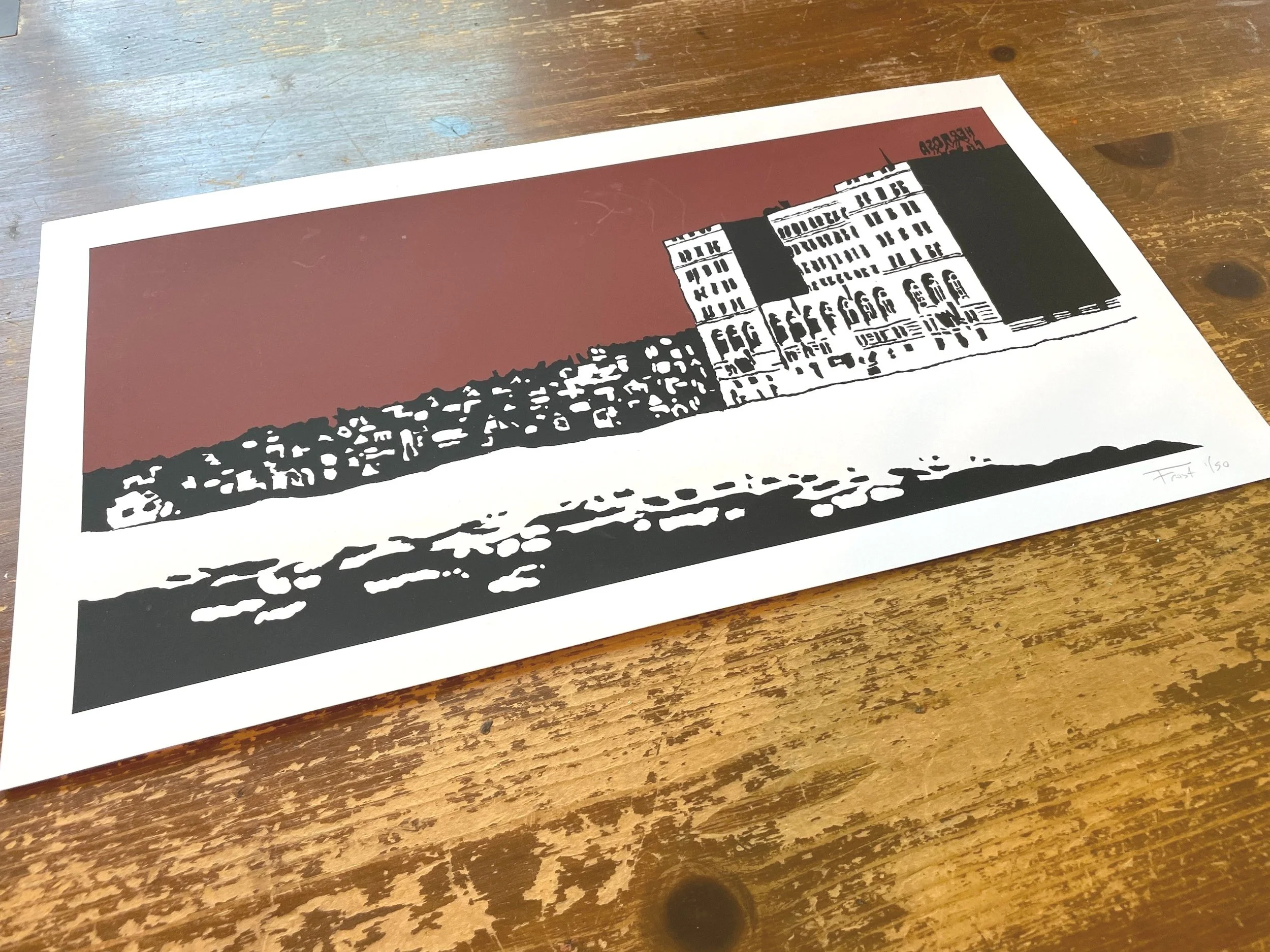 Perfectly capturing the vibe of a forgotten era of Los Angeles history, this noir scene from Hermosa Beach past will be the perfect piece of art for your home. Capturing the long-gone Biltmore Hotel looming over the ocean ominously, this poster recalls a time in Hermosa Beach's past that many have now forgotten. With a bright red sky, this is a unique take on history that is a must for any collector.